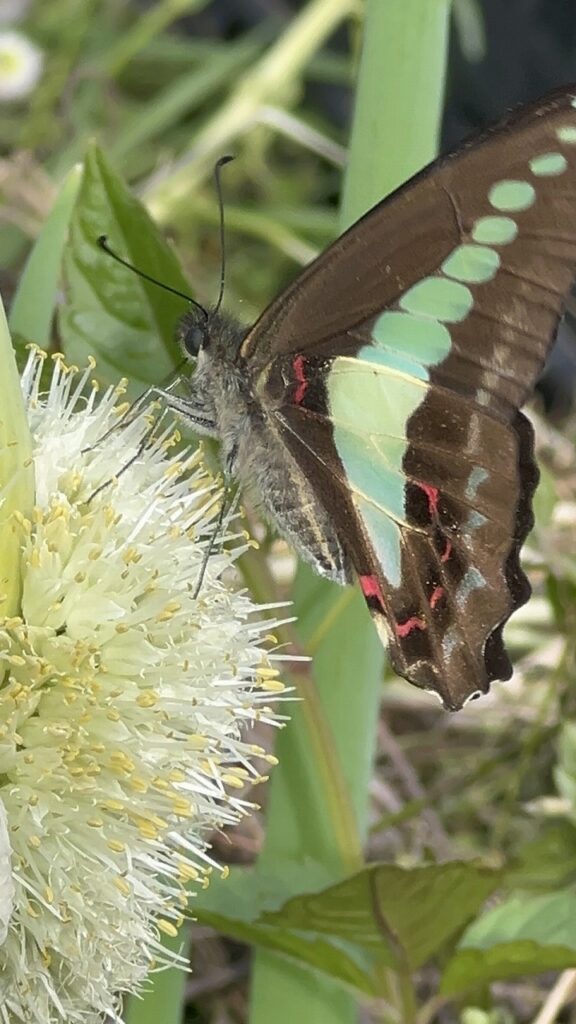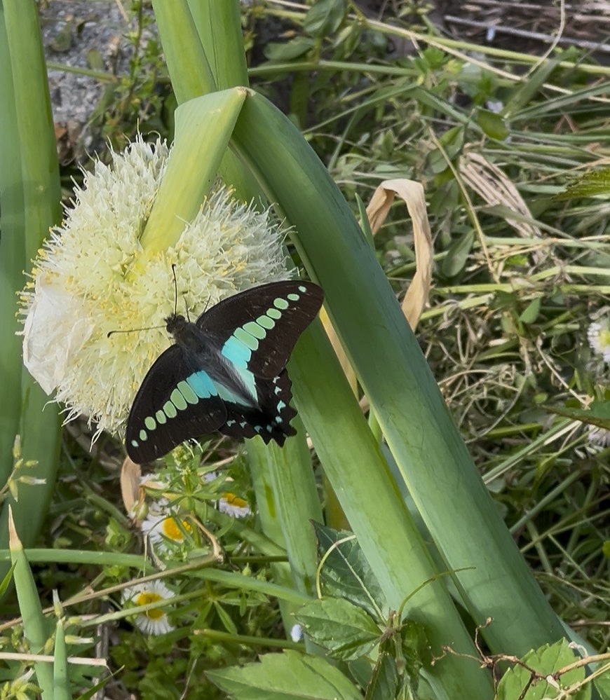 大学内の畑を散歩していたら、とても綺麗な青色の筋の入ったアオスジアゲハがネギの花の蜜を吸っていました。アオスジアゲハは青緑の帯には鱗粉がなく、鮮やかな色をしており、複眼が発達していて、昆虫の中では最も多くの色を識別できるのが特徴です。また雌雄で羽の模様が良く似ているため、雌雄判別はお尻の形で判別します。今回会ったのはおそらく雌だと思います!