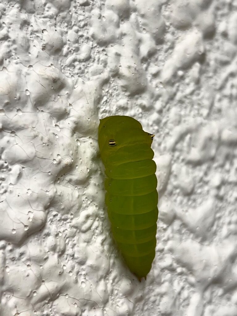 実は、去年の九月に畑の近くの壁にアはオスジアゲハの幼虫を見つけ、無事に孵化したようで、さなぎの抜け殻だけになっていました。同じ個体ではないと思いますが、成虫も見る事ができてとても嬉しい気持ちです!